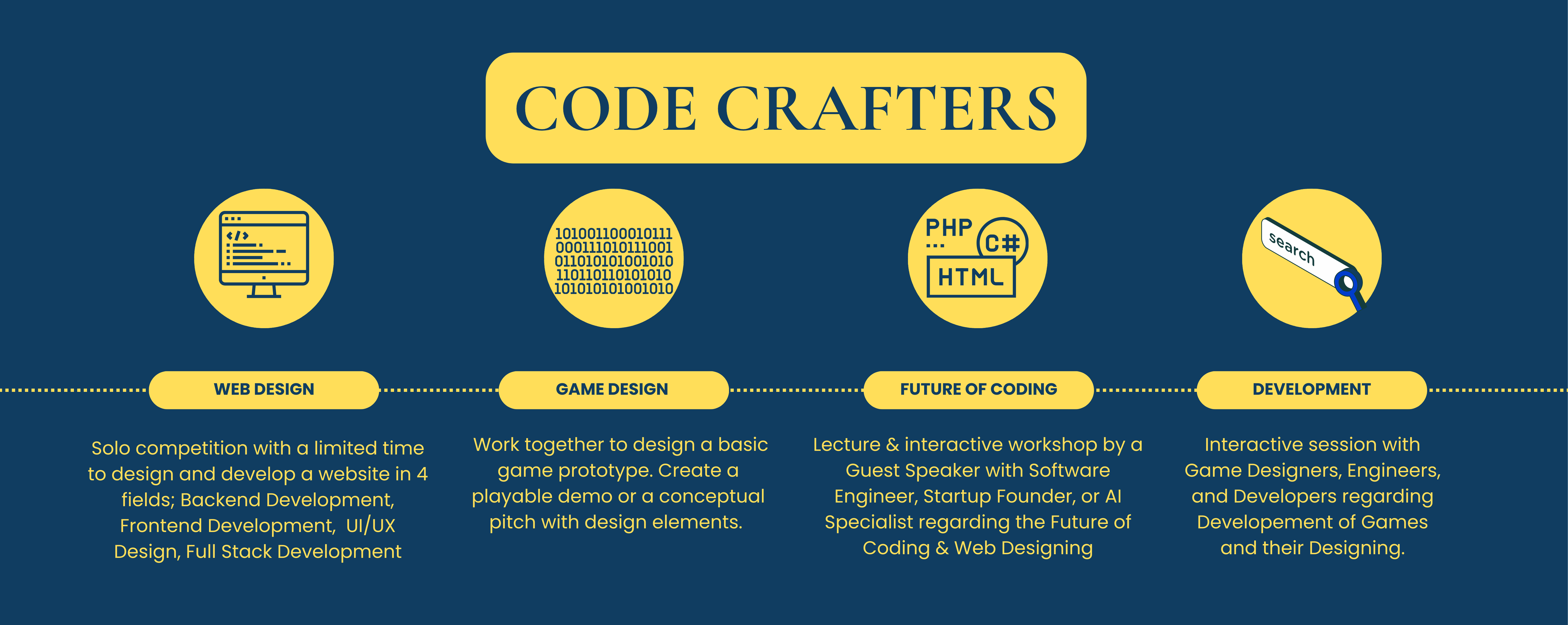 Join Code Crafters and embark on an innovative journey of coding and creativity! Engage in coding and software environments with professionals. Teaching code enthusiasts the basis of coding, software, and web designing.