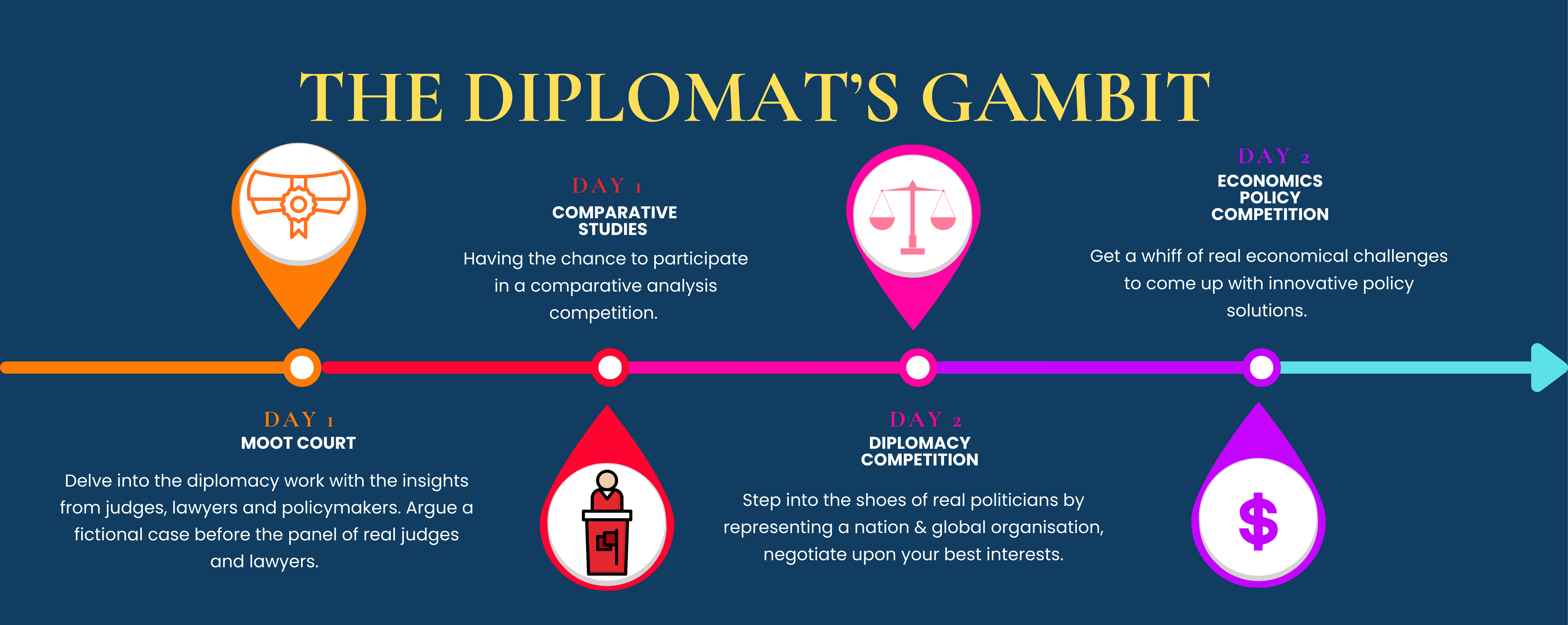 Step into the world of law, diplomacy, and economic policy at The Diplomat’s Gambit. Argue in a courtroom showdown, dissect historical and modern conflicts, negotiate like a seasoned diplomat, and craft policies to solve real-world economic crises—all alongside junior visionaries, future lawyers, policy analysts, and global leaders.